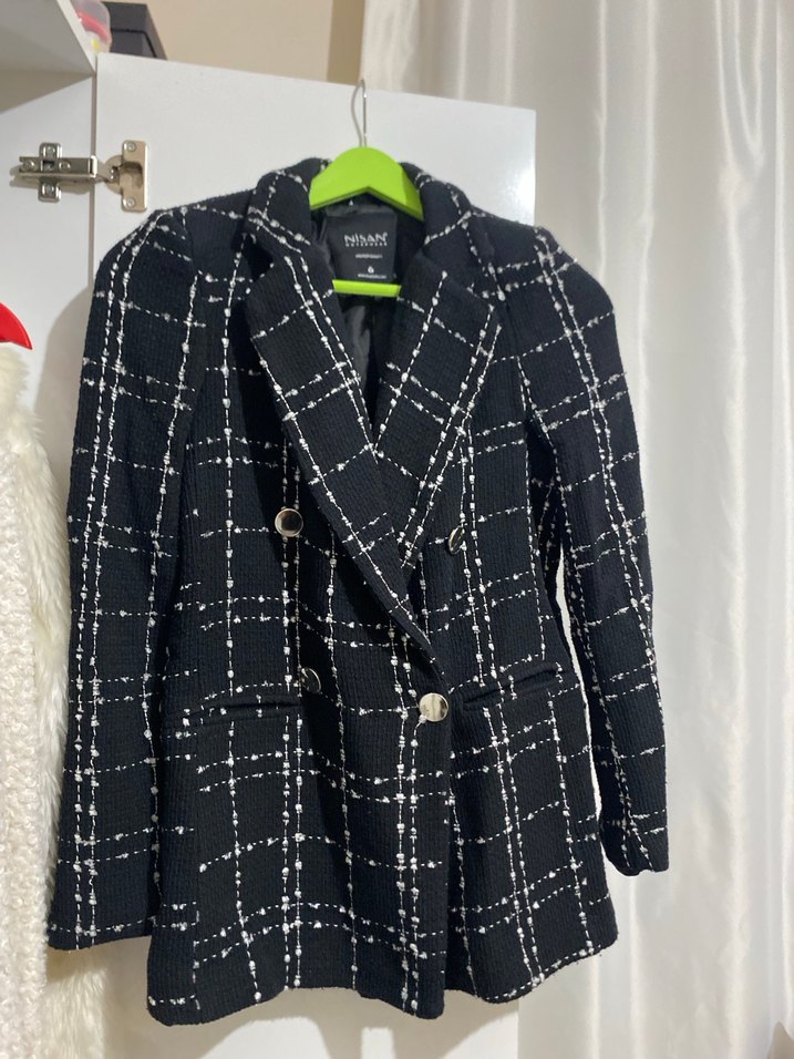 Düğmeli, siyah ekose desene sahip bu mini blazer, kesimli yaka ve askılı kollarıyla dikkat çeker. Sentetik kumaştan yapılmış, ofis için uygun kısa ve rahat kesimdir.