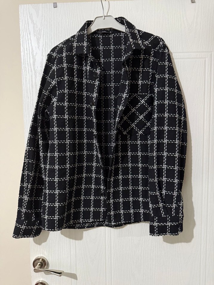 Siyah ekose desenli, uzun kollu ve düğmeli önü olan, normal kesim ve notched lapel yakalı kadın gömleği. Günlük sokak stili için uygundur.