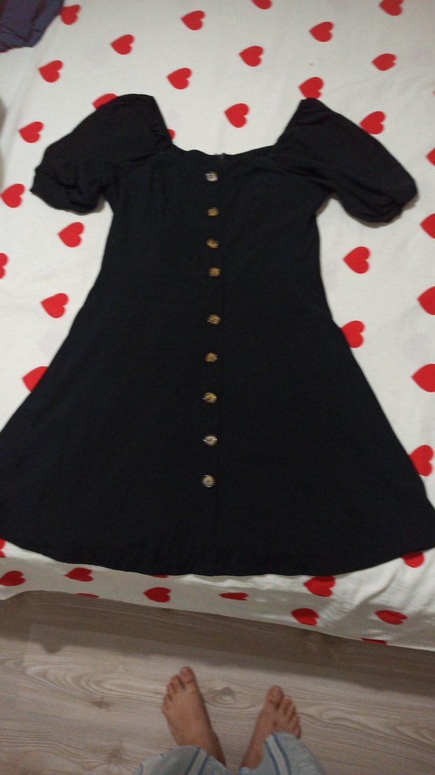 Düğmeli, kısa balon kollu, kare yakalı diz hizasinda siyah elbise, üst kısım vücuda ötüyor yırtık leke yoktuk