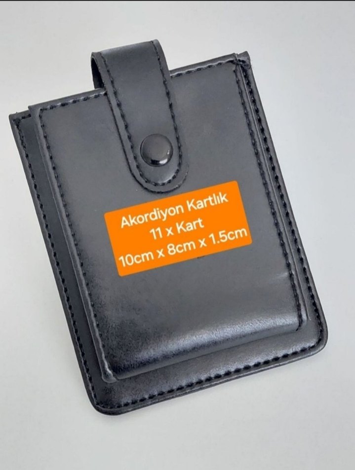 Düğmeli siyah erkek biker cüzdan, 10x8x1.5 cm ölçülerinde, 11 kartlık akordiyon kartlık içerir.