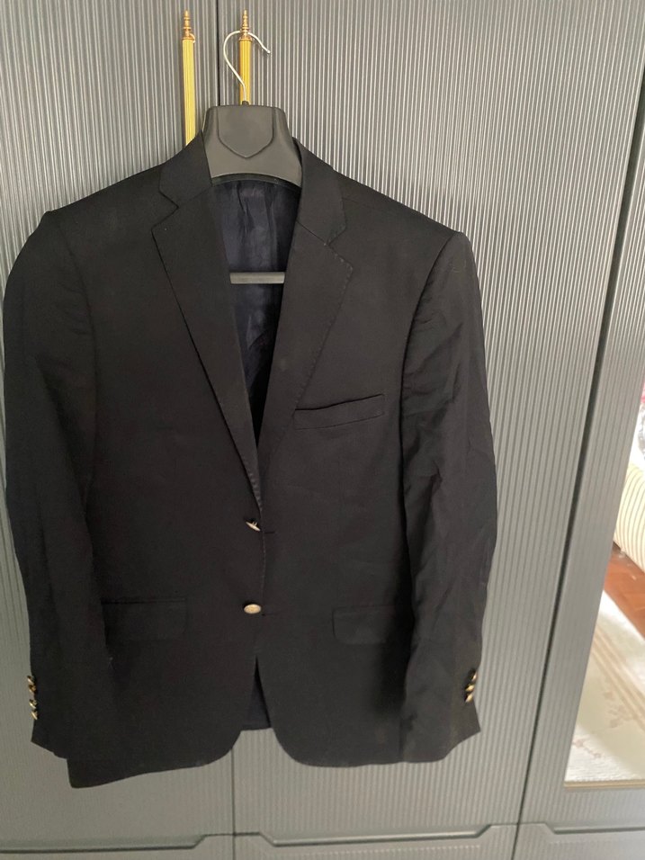 Düğmeli, normal boy, siyah erkek ceket. Notch yakalı ve uzun kollu, klasik şıklık için uygun.