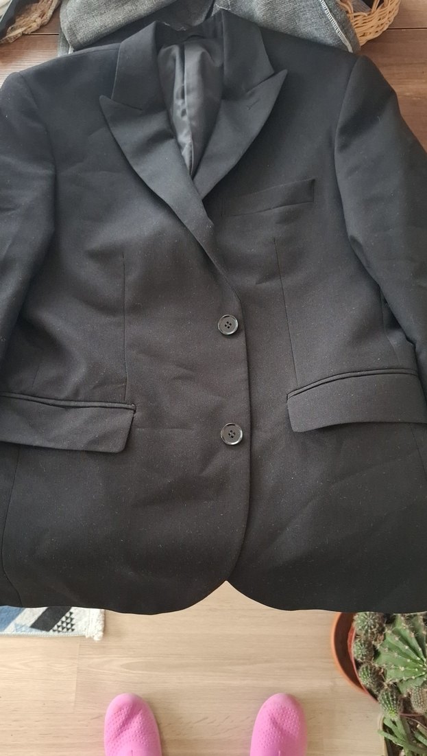 Düğmeli, siyah renkli erkek takım elbise ceketi, notched yaka ve regular fit ile klasik ofis şıklığı sunar. Uzun kolludur ve desen içermez. ️Bir sefer kullanılmıştır.