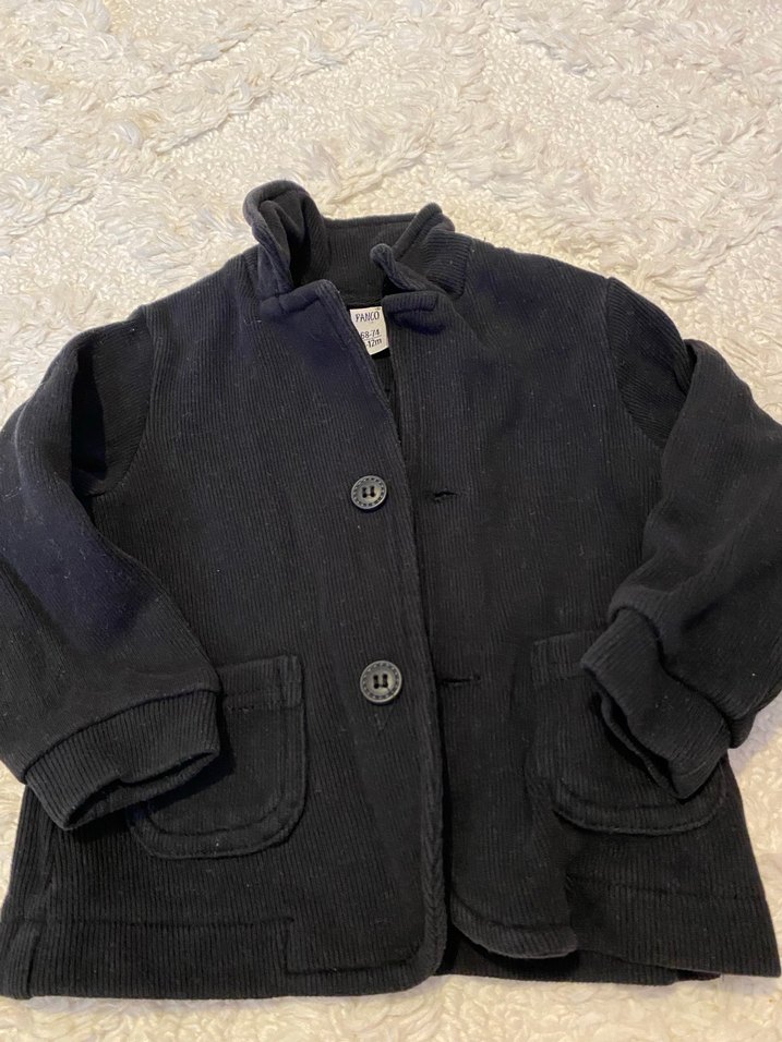 Düğmeli, siyah erkek çocuk ceketi, geniş kesimli ve iki cepli. Yumuşak, sıcak kumaştan üretilmiştir, sokak giyimi tarzına uygundur.