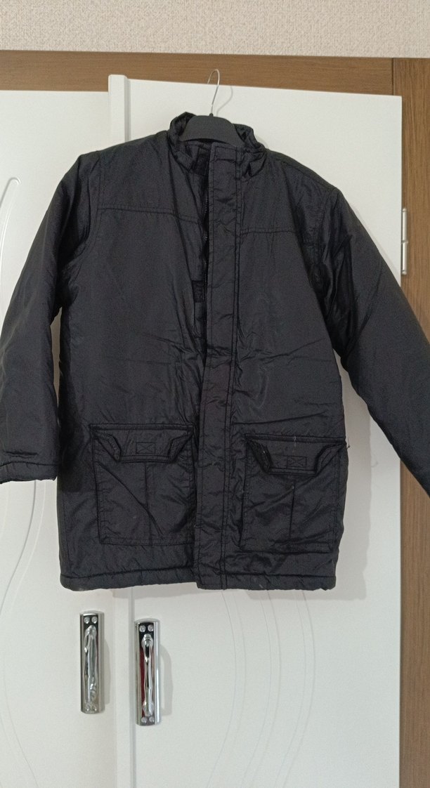 siyah erkek çocuk kabanı, kesik yaka ve regular fit. Yumuşak ve sıcak kumaştan, sade streetwear tarzında. Bazı deformeler var fakat kullanıma engel değil son fotoğrafta belirttim