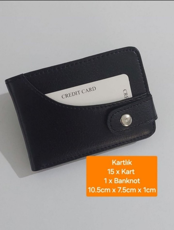 Siyah erkek cüzdanı, düğmeli kapama ve 15 kart ile 1 banknotluk bölme içerir. Ölçüleri 10.5cm x 7.5cm x 1cm.