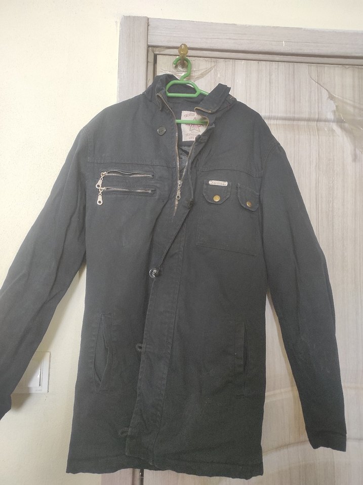 Düğmeli, siyah renkte, normal uzunlukta ve düğmeli erkek denim cekettir. Cep fermuarları ve düğmeleriyle günlük sokak modasına uygundur.