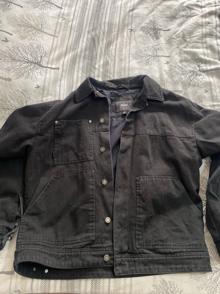 Düğmeli ön kısmı ve kesilmiş yakası olan siyah denim ceket. Salaş kesim, uzun kollu ve midi boyda, günlük sokak stiline uygun.