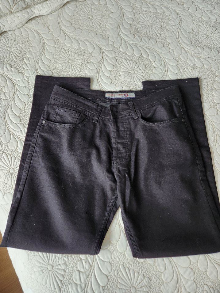 Düğmeli, siyah renkli erkek denim pantolon. Regular fit ve normal boyda, günlük sokak stili için uygun. Hiç Giyilmedi Bel 40 Boy 95 Paça 17