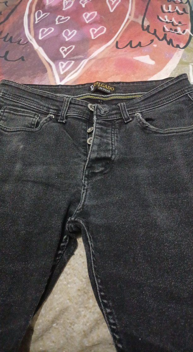 Düğmeli siyah denim pantolon, baskılı desenli ve normal boyda. Fitted kesimiyle günlük sokak tarzına uygun.