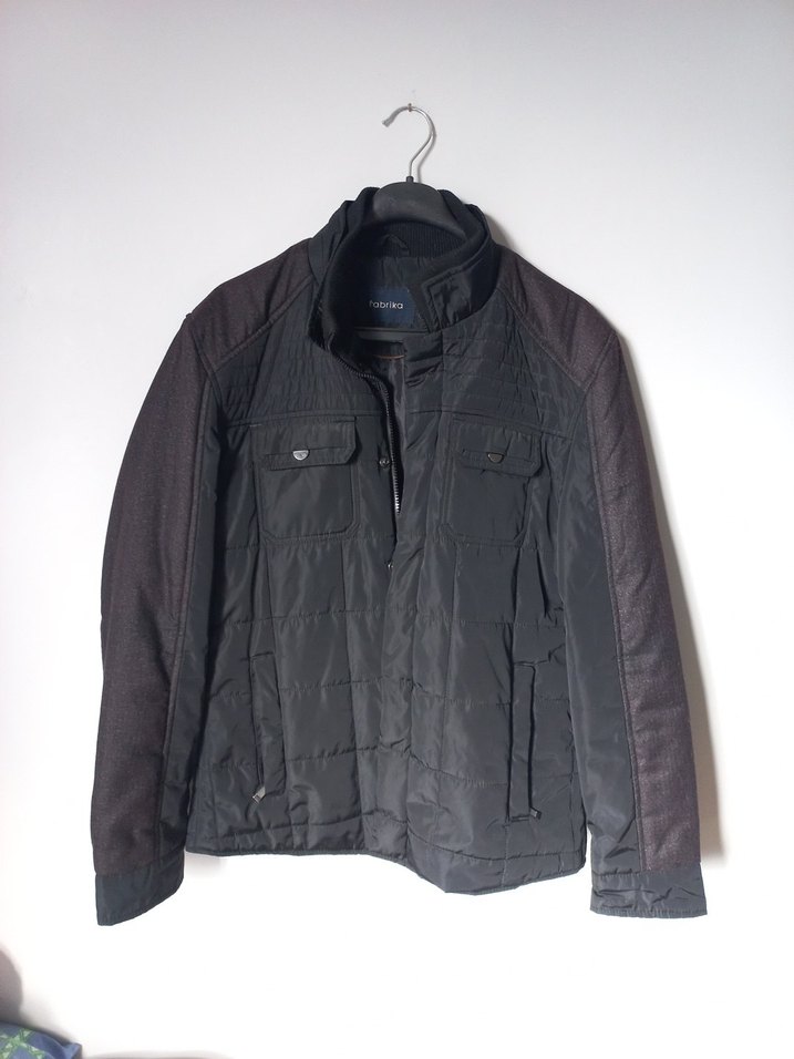 Düğmeli ve fermuarlı ön kapaması ve kesik yakası olan siyah erkek Fabrika mont. Sentetik kumaştan, normal kesim, uzun kollu ve midi uzunluğundadır. Günlük kullanıma uygundur.