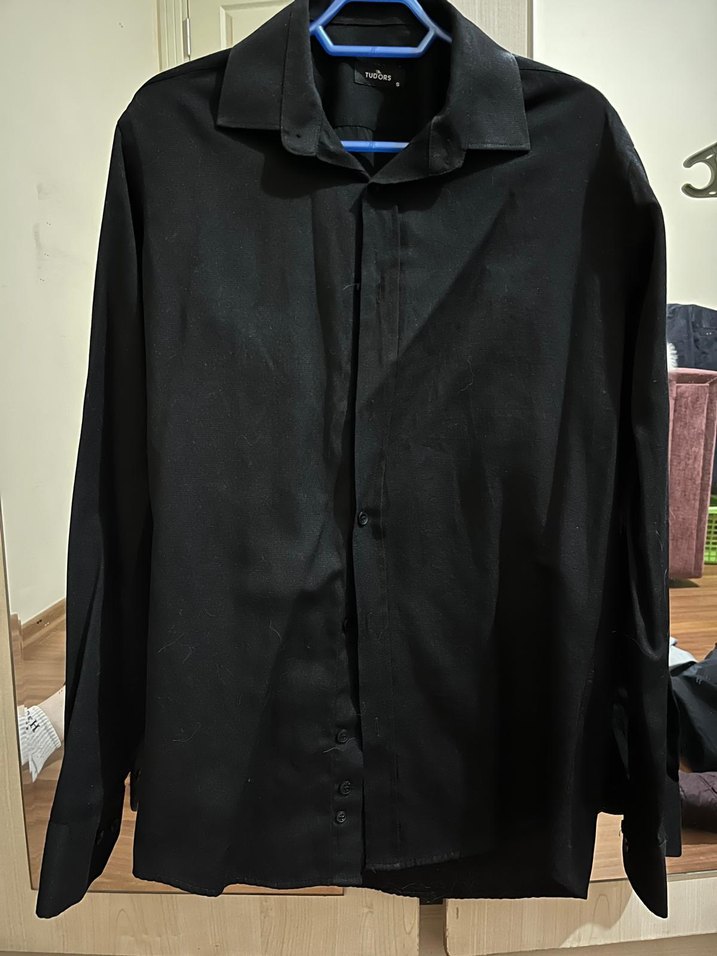 İpek dokulu siyah erkek gömleği, kesikli yakalı ve düğmeli uzun kolludur. Regular fit ve düz desensiz, ofis için uygundur.