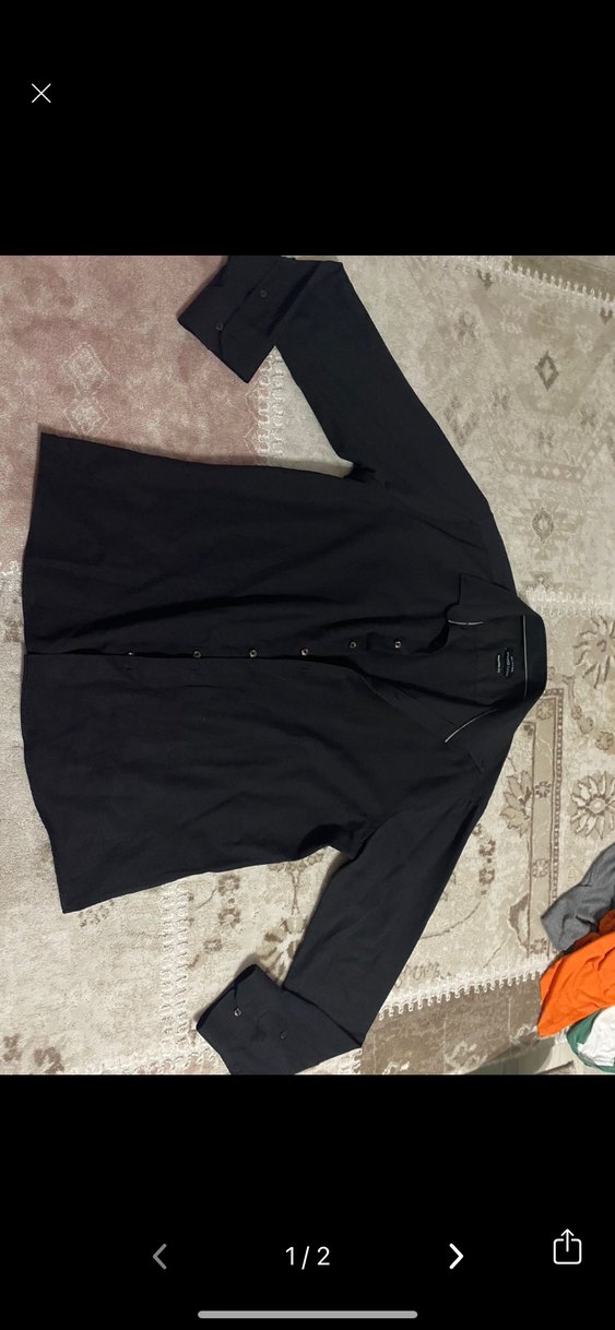 Düğmeli önü, uzun kollu ve kesik yaka detaylı siyah erkek gömleği. Normal kesim ve midi boyda, sentetik dokulu kumaştan üretilmiştir.