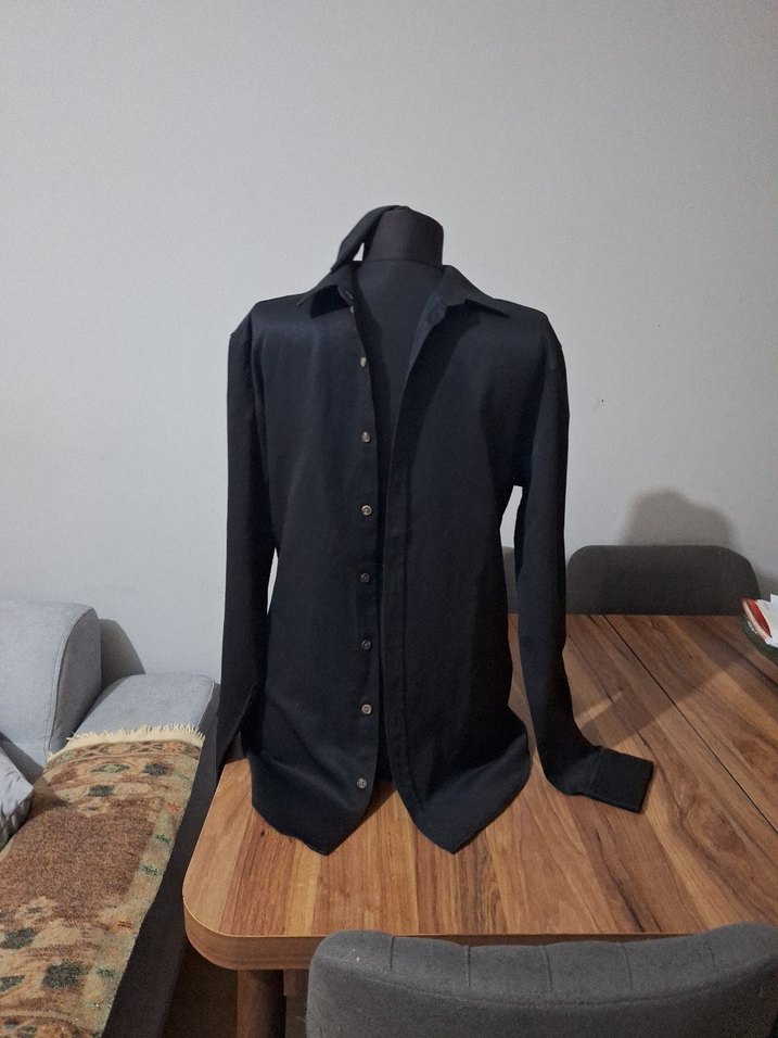 Düğmeli ve notched lapel yakalı siyah erkek gömlek, regular fit ve uzun kolludur. Ofis için uygun, düz ve koyu renklidir.