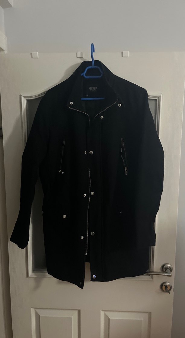 Düğmeli, siyah erkek midi kaban, çıtçıtlı yakalı, uzun kollu ve normal kesim. Yumuşak ve sıcak kumaştan, günlük sokak stili için uygun.