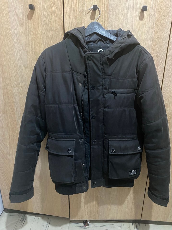 Düğmeli, kapüşonlu siyah erkek ceket, uzun kollu ve fitted kesimlidir. Yumuşak ve sıcak kumaştan üretilmiş, günlük sokak stili için uygundur. Görselde görülüldüğü gibi