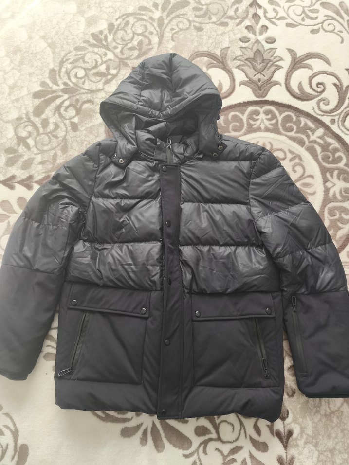 Düğmeli, kapüşonlu siyah erkek kaban, midi boy, uzun kollu ve fitted kesim. Sokak stiline uygun yumuşak sentetik kumaştan üretilmiştir.