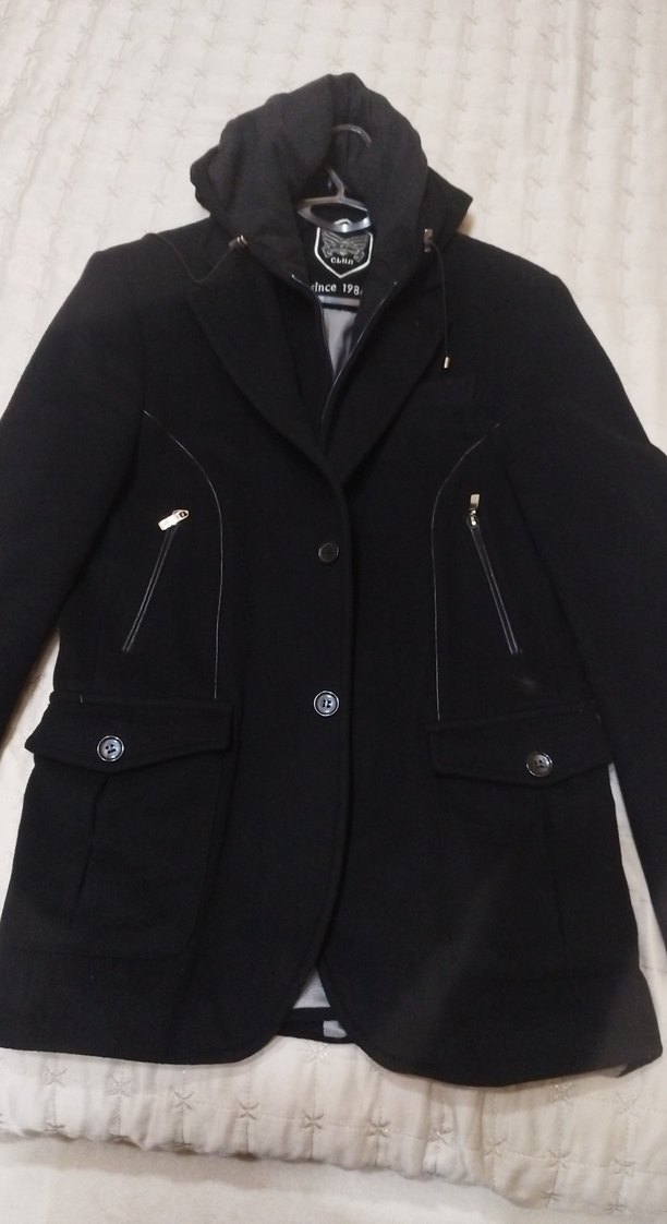 Düğmeli, siyah erkek ceket, kesik yakalı ve uzun kolludur. Normal kesim ve yumuşak, sıcak kumaştan günlük kullanıma uygundur. hiç bir defosu yoktur