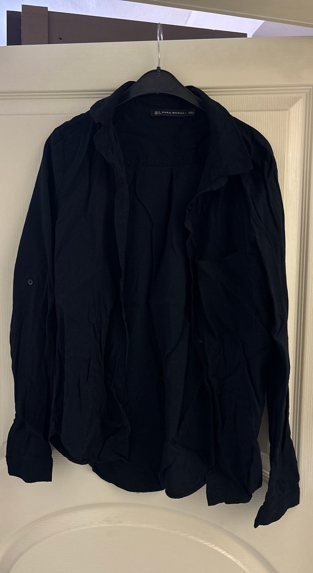 Uzun kollu, düğmeli, siyah keten gömlek. Notch yakalı ve bol kesim, ofis kullanımı için uygun.