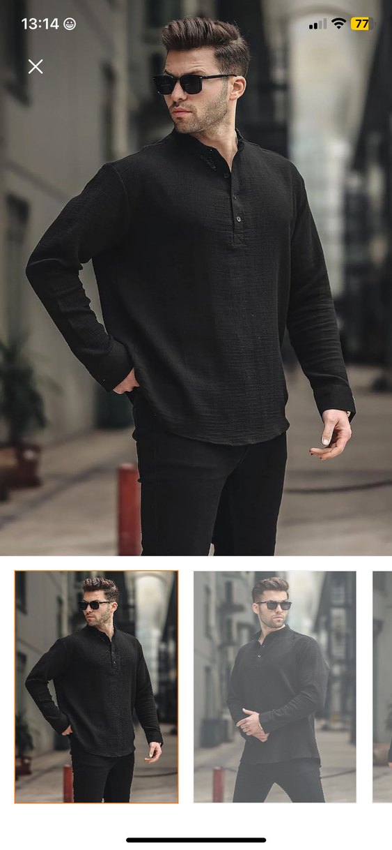 Düğmeli, uzun kollu siyah erkek keten gömlek, regular fit ve yuvarlak yakalıdır. Günlük rahat kullanıma uygundur.