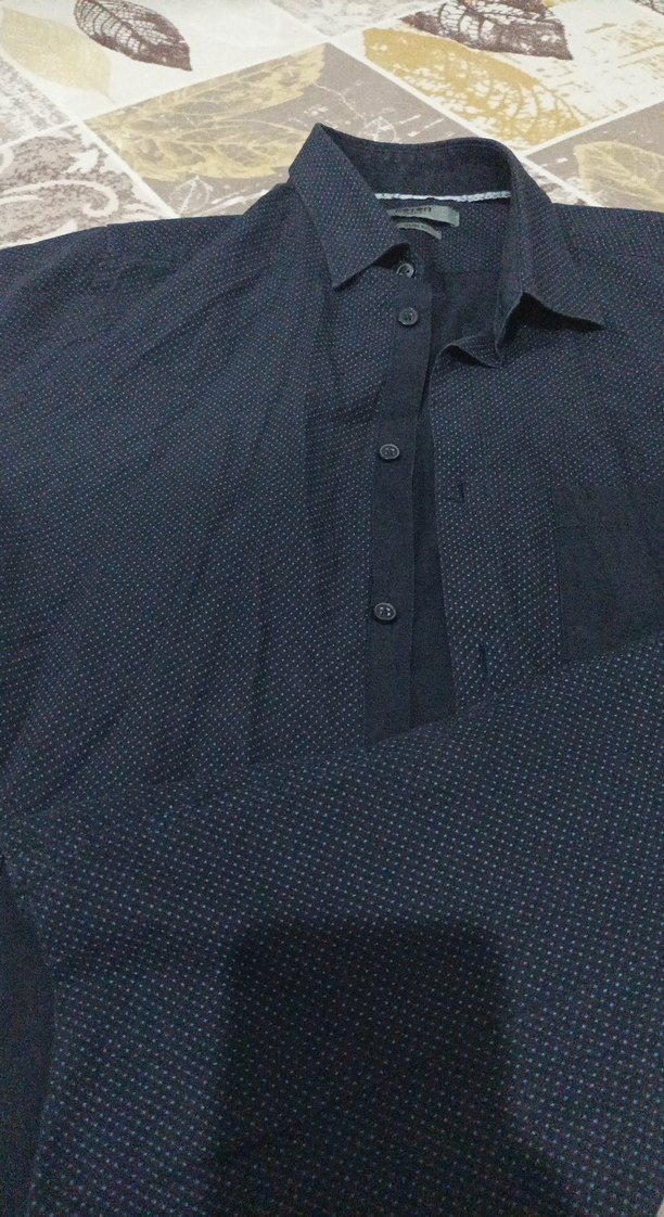 Düğmeli, kısa kollu, siyah erkek gömleği. Notch yaka, normal kesim ve sentetik dokulu kumaştan, ofis ve günlük kullanım için uygundur.