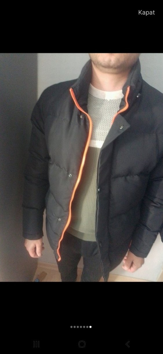 Düğmeli, yüksek yakalı ve dar kesim siyah erkek mont. Yumuşak, kalın kumaşı ve uzun kollarıyla günlük sokak tarzı için uygun. arkasında gösterdiğim gibi küçük bir delik var onun dışında bir sorunu yok