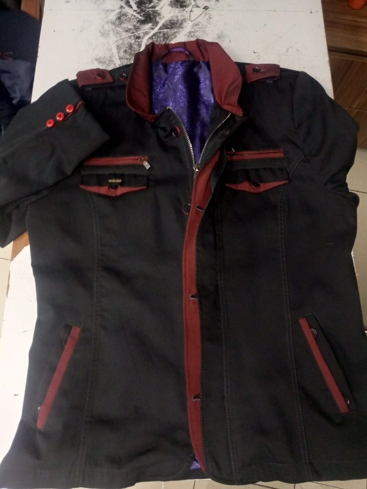Düğmeli ve baskılı detaylara sahip siyah erkek midi ceketi, notched yaka ve uzun kolludur. Sentetik kumaştan yapılmış, normal kesim ve günlük kullanıma uygundur.