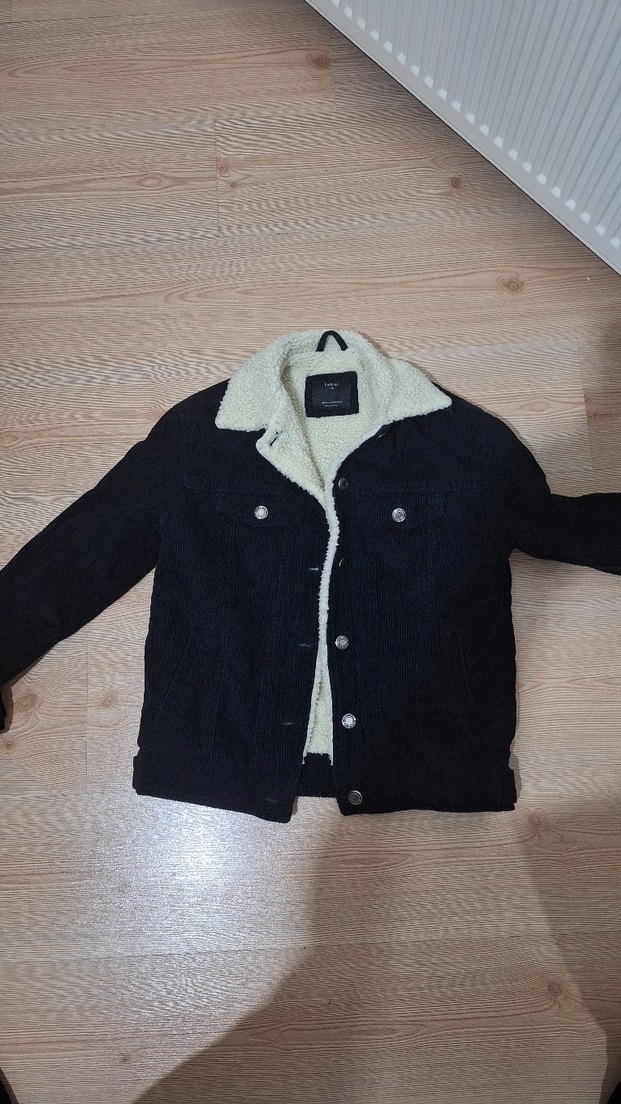 Düğmeli, uzun kollu, siyah erkek midi ceket. Notch yaka ve yumuşak, sıcak iç astar ile günlük sokak giyimine uygun.