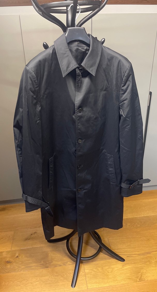 Siyah erkek midi kaban, düğmeli ve kesilmiş yaka detayına sahiptir. Sentetik kumaştan üretilmiş, uzun kollu ve regular fit modeldir. Ofis için uygundur.