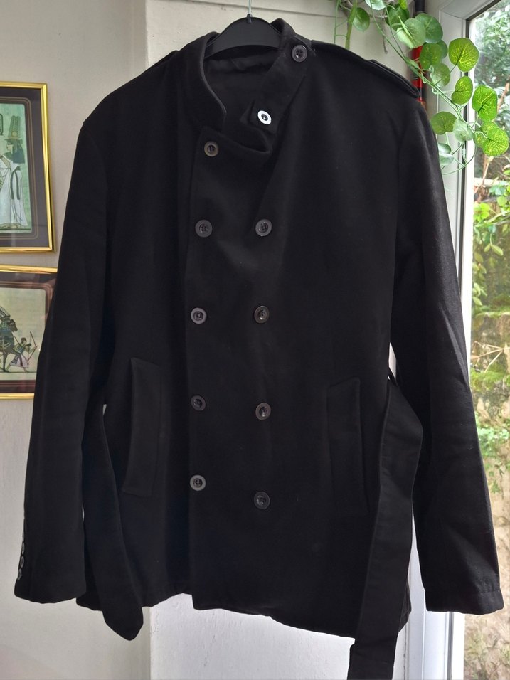 Düğmeli önü ve keskin yakasıyla siyah erkek kabanı, yumuşak ve sıcak kumaştan üretilmiştir. Normal kesim, uzun kollu ve midi boydadır, ofis için uygundur.