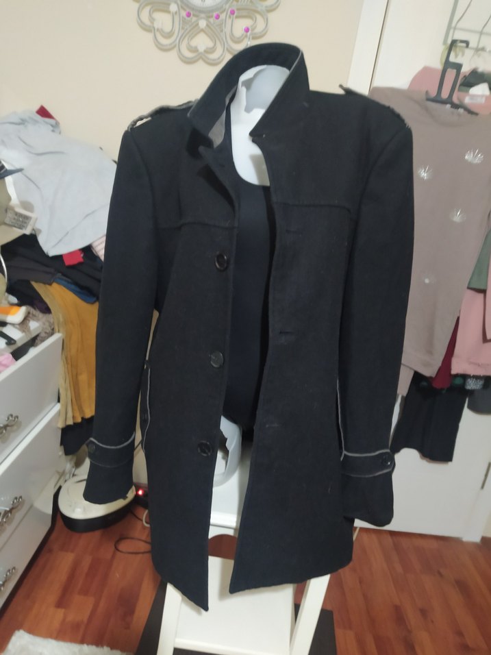 Düğmeli, sivri yakalı erkek midi kaban, uzun kollu ve siyah renkte, yumuşak ve sıcak kumaştan üretilmiştir. Sokak ve iş stiline uygundur.