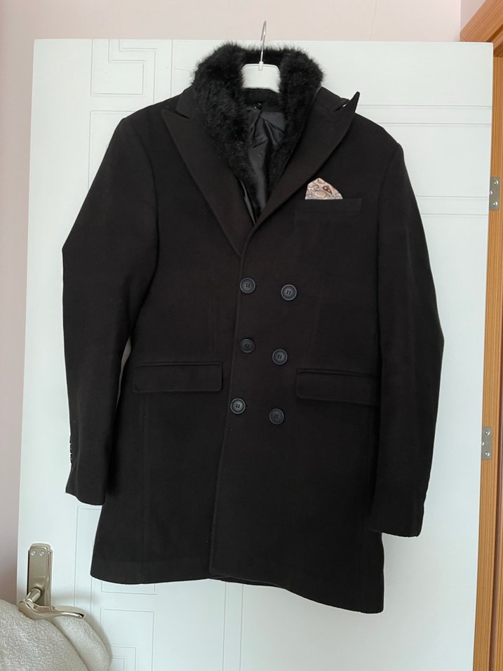 Düğmeli, siyah renkte erkek midi kaban. Yumuşak ve sıcak kumaştan, regular fit ve uzun kollu, ofis kullanımı için uygun.