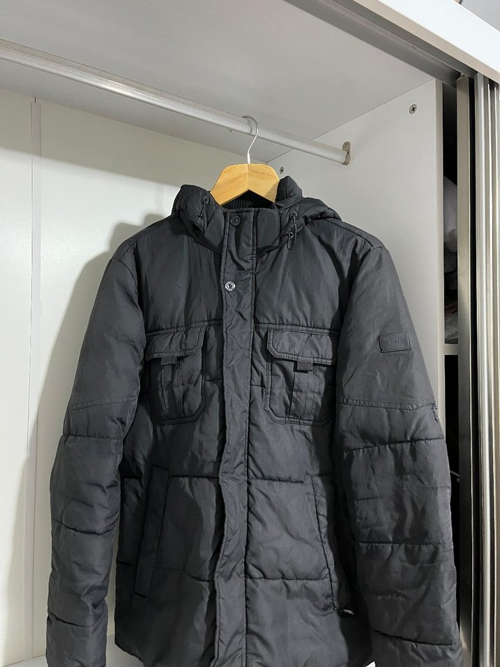 Düğmeli, uzun kollu, siyah ve fitted erkek mont. Notched lapel yakalı, midi boyda, dış mekan için uygun, sokak stili tarzında. Ürün resimde görüldüğü gibi cep kısmında sökük vardır