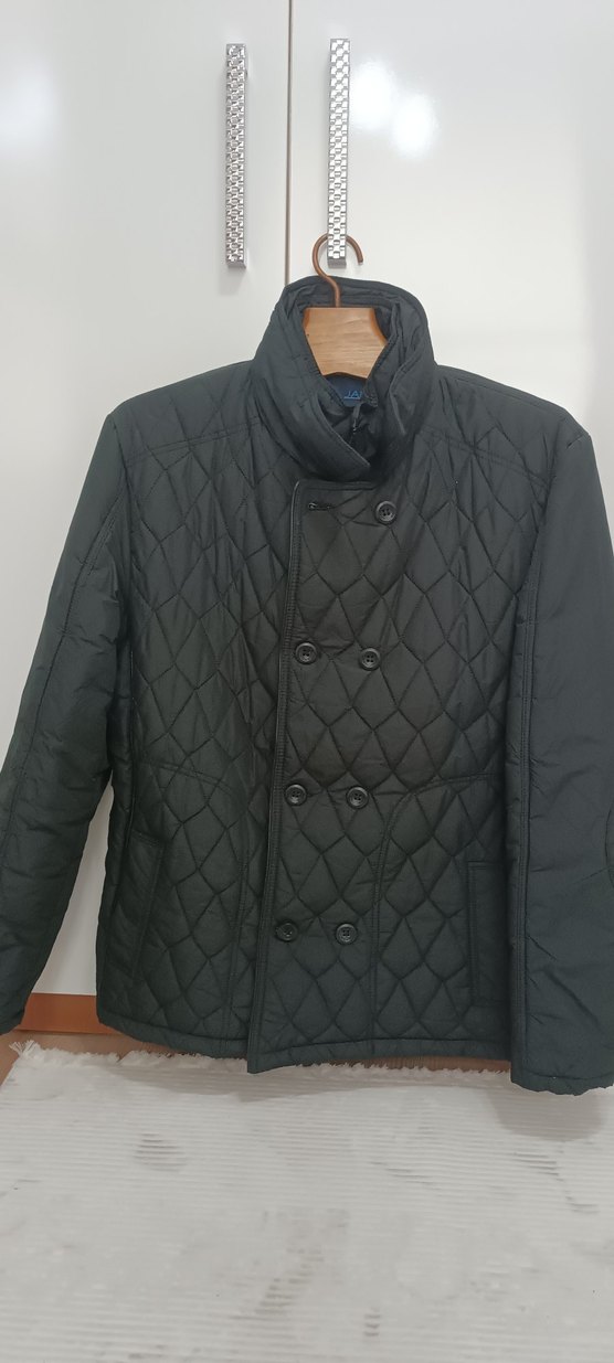 Düğmeli ön ve kesik yaka detaylı siyah erkek mont. Sentetik kumaştan, normal kesim ve günlük kullanıma uygun uzun kollu midi boy.