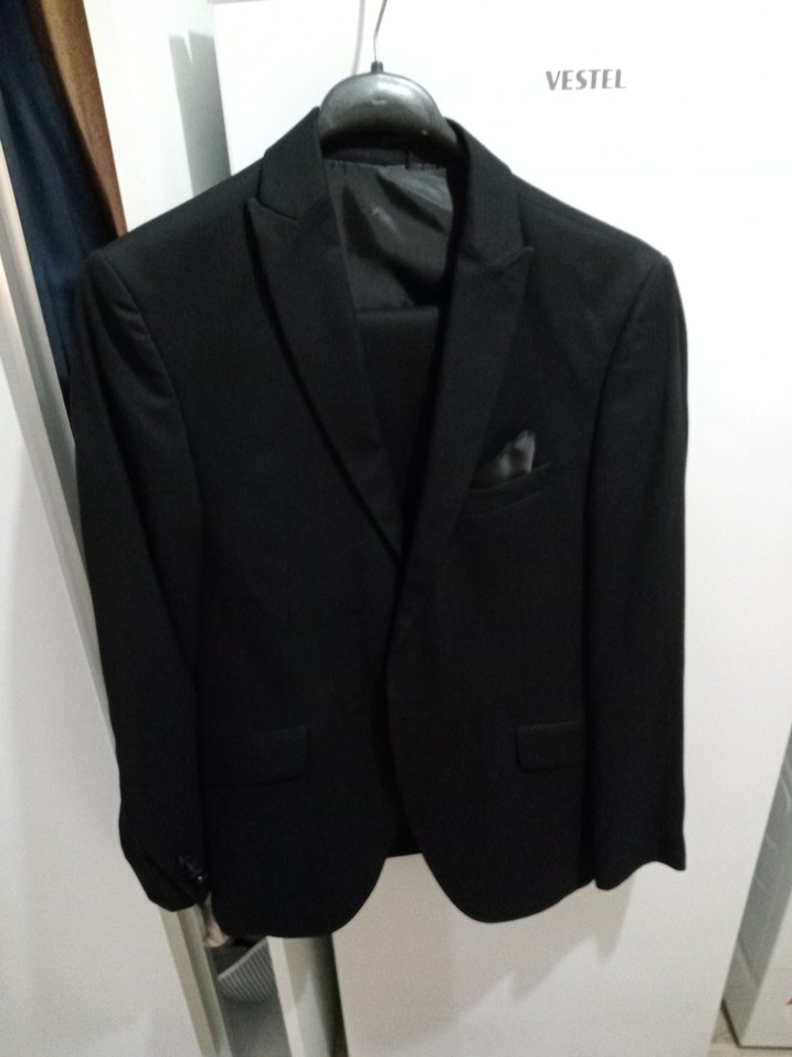 Düğmeli, normal boy siyah erkek takım elbise, klasik ofis stiline uygun, regular fit ve uzun kolludur. Desensiz ve koyu goth tarzındadır. pantolon beli 42 cm pantolon boyu 110 cm