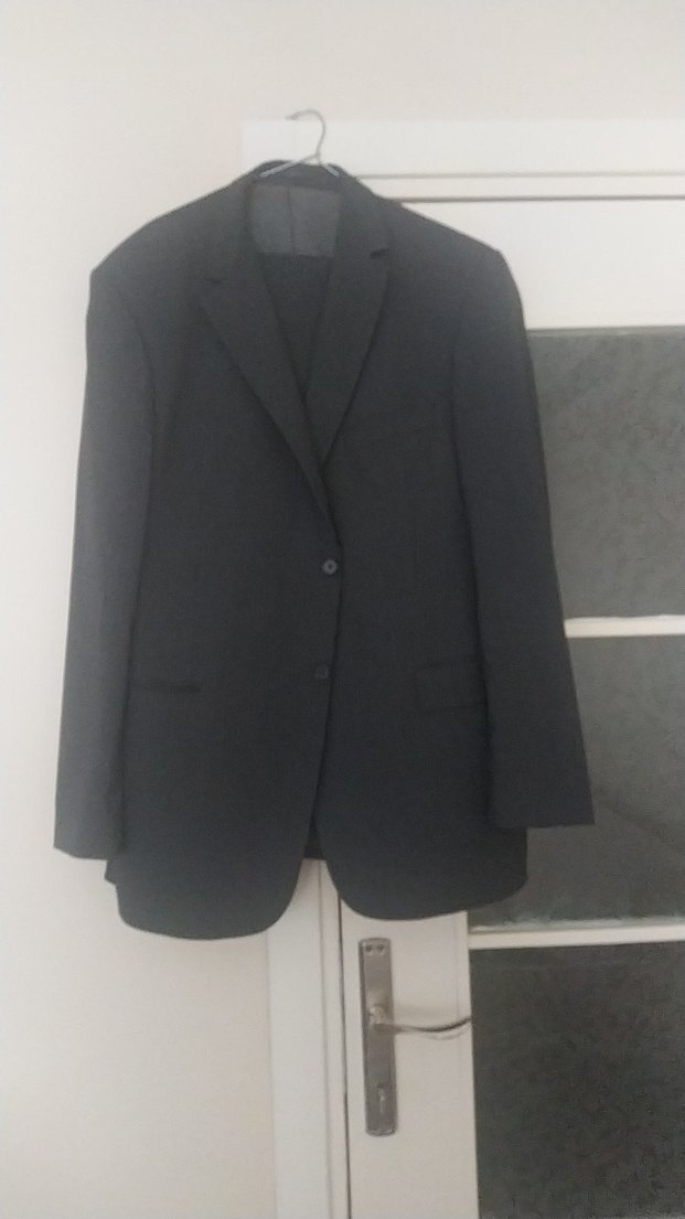 Çizgili düğmeli gri erkek takım elbise, normal uzunlukta, klasik kesim ve tek düğmeli ön kapama ile ofis kullanımı için uygundur. Uzun kollu ve desensizdir. ️ pantolon beli 49 boyu 110 ceket boyu 83 dür koldan diğer kola 60 dır 100/105 kilo arası kişilere uygundur