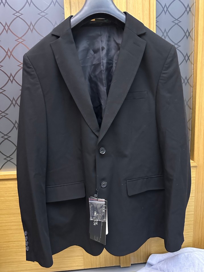 Düğmeli, normal boyda siyah erkek takımı, keskin yaka ve uzun kollu. Klasik, desen içermeyen tasarımı ofis ve sokak stiline uygundur. ️