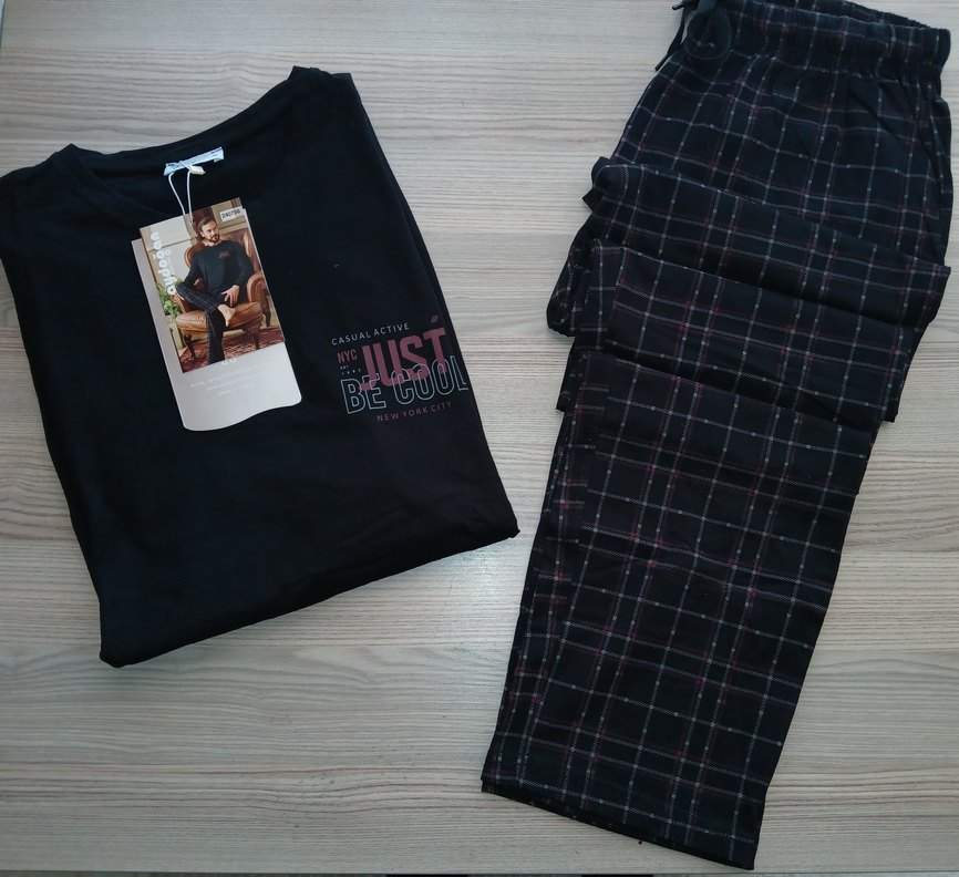Düğmeli siyah uzun kollu üst ve desenli, koyu renk kareli pantolonlu erkek pijama takımı. Regular fit ve bisiklet yaka detaylıdır. ️