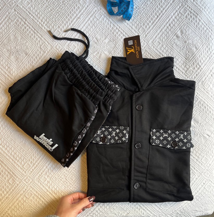 Düğmeli uzun kollu, işlemeli detaylara sahip siyah üst ve lastikli bel, rahat erkek pijama takımı. Athleisure tarzında şık ve gündelik görünümlü. Tercihe göre unısex kullanılabilir.