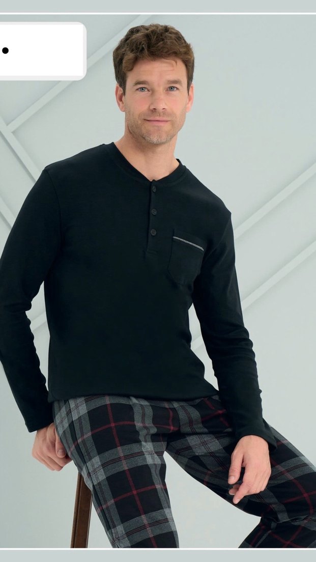 Düğmeli, uzun kollu, bisiklet yakalı erkek pijama takımı. Normal kesim ve küçük göğüs cebine sahip, koyu siyah renkte modern ve rahat bir tasarım. Ekose altı.#biricikicgiyim #erkekpijama #pijama #pijamatakımı #pijamagiyim