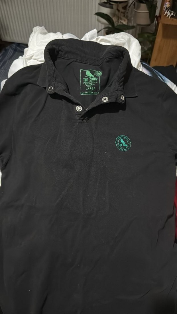 Düğmeli yakalı, uzun kollu, siyah erkek polo tişört. Sentetik kumaştan, baskılı logo ve normal boyda, dış mekan kullanımı için uygun.