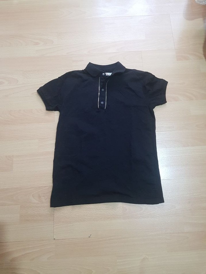 Düğmeli, kısa kollu, yakalı siyah erkek polo tişört, günlük kullanım için yumuşak sentetik kumaştan üretilmiştir.