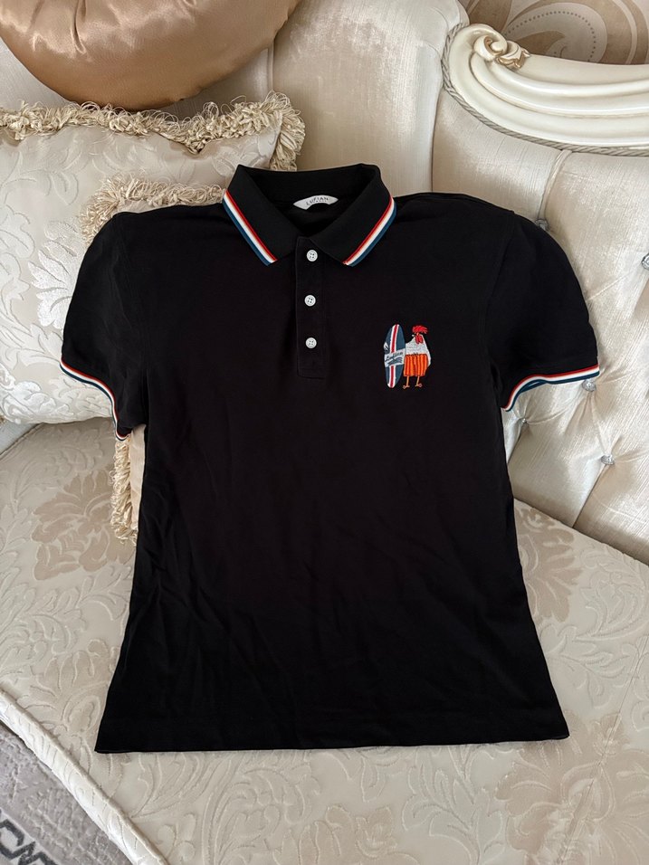 Pamuklu kumaştan yapılmış, düğmeli ve baskılı detaylı siyah erkek polo tişört. Kısa kollu, yakalı ve dar kesimdir, günlük kullanıma uygundur.