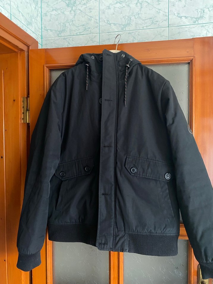 Düğmeli ön kapama, notched yaka ve uzun kollu siyah erkek mont. Sentetik kumaştan, regular fit ve midi boyda, günlük sokak stili için uygun.