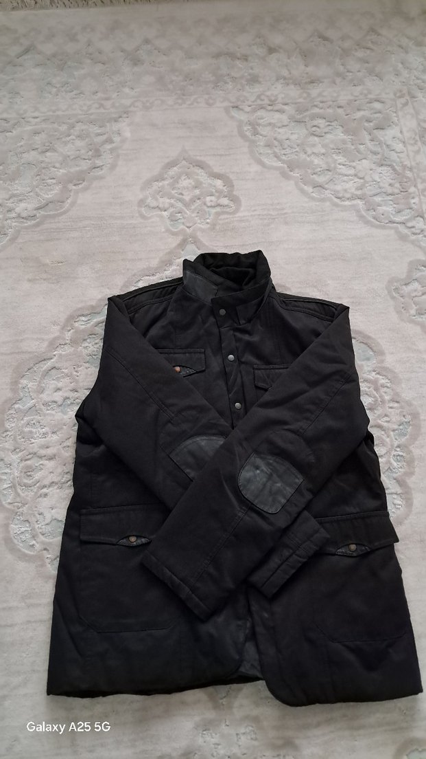 Düğmeli, uzun kollu ve dirsek yamalı siyah erkek ceket. Regular fit ve midi boyda, yumuşak ve sıcak kumaştan, street style tarzına uygun.