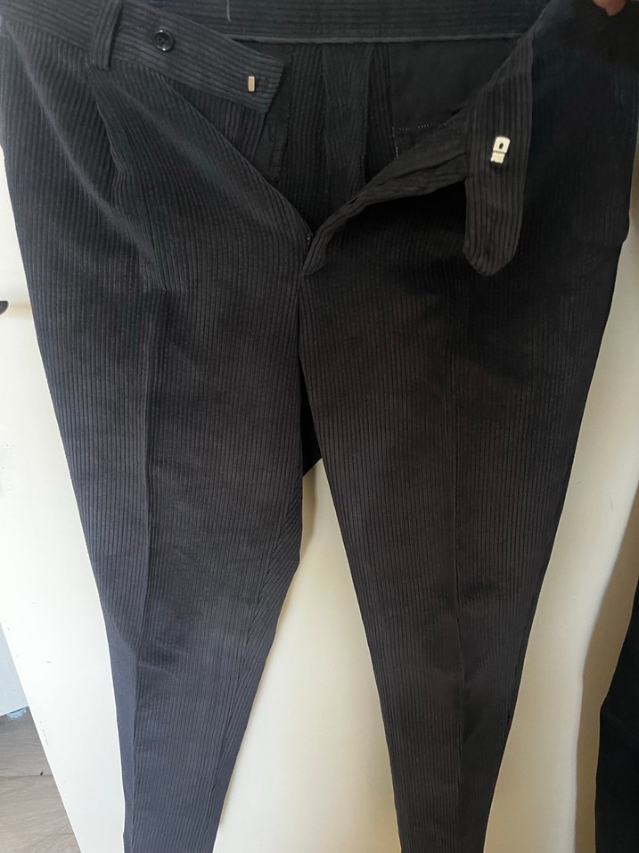 Düğmeli siyah süet erkek pantolon, normal boy ve regular fit. Ofis ve sokak tarzına uygun, desensiz midi uzunlukta.