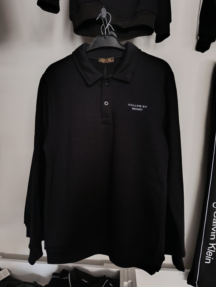 Düğmeli ön kısmı ve baskılı detaylarıyla, uzun kollu ve yakalı siyah erkek sweatshirtü, rahat kesime sahiptir.