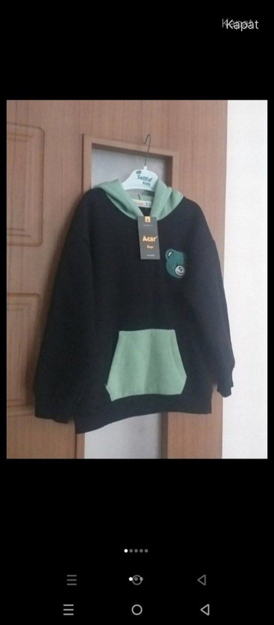 Düğmeli, kapüşonlu siyah erkek sweatshirt, uzun kollu ve bol kesimdir. Yeşil kapüşon ve cepleriyle, baskılı desenlidir ve rahat, sıcak kumaştan üretilmiştir.