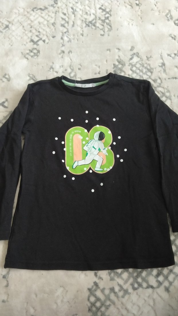 Düğmeli, baskılı astronot desenli, uzun kollu ve bisiklet yaka siyah erkek sweatshirt. Yumuşak ve sıcak dokulu kumaştan üretilmiştir.