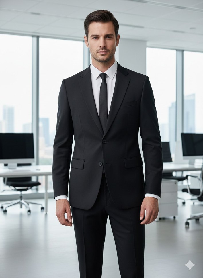 Düğmeli, klasik kesim siyah erkek takım ceketi, normal boy ve uzun kollu, ofis kullanımı için uygundur. ️