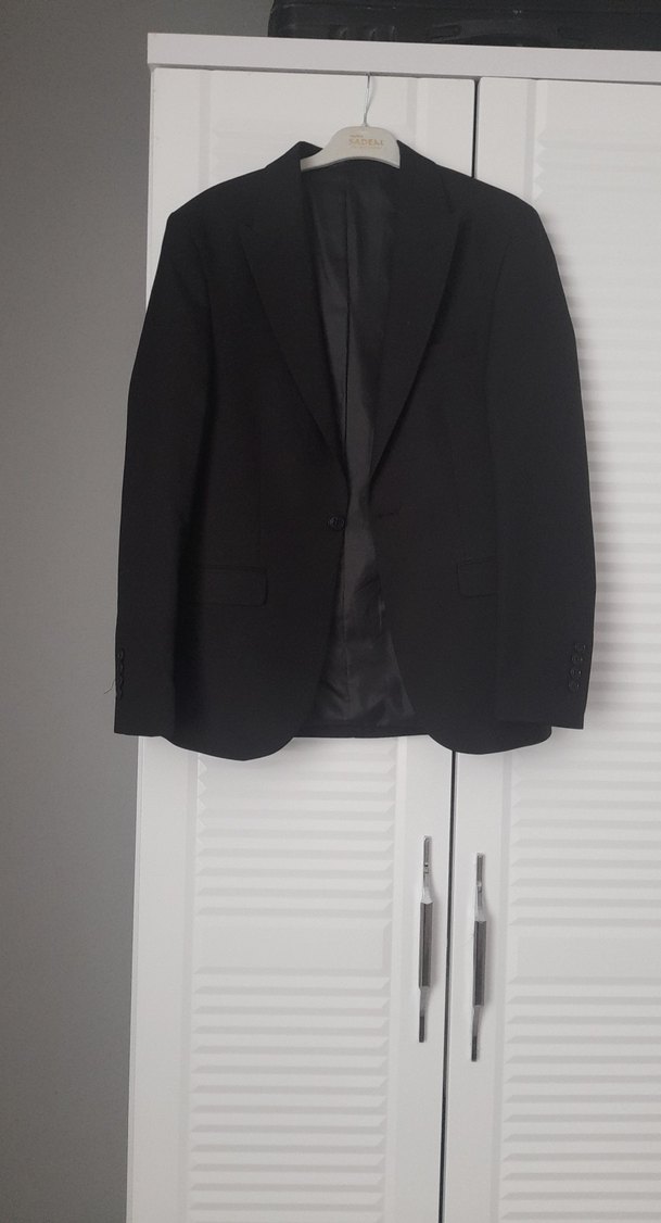 Düğmeli, siyah erkek takım ceketi, klasik modern tarzda, normal boyda ve uzun kolludur. Ofis ve iş ortamları için uygundur. ️eşim damatlıkta kullandı birkaç saat